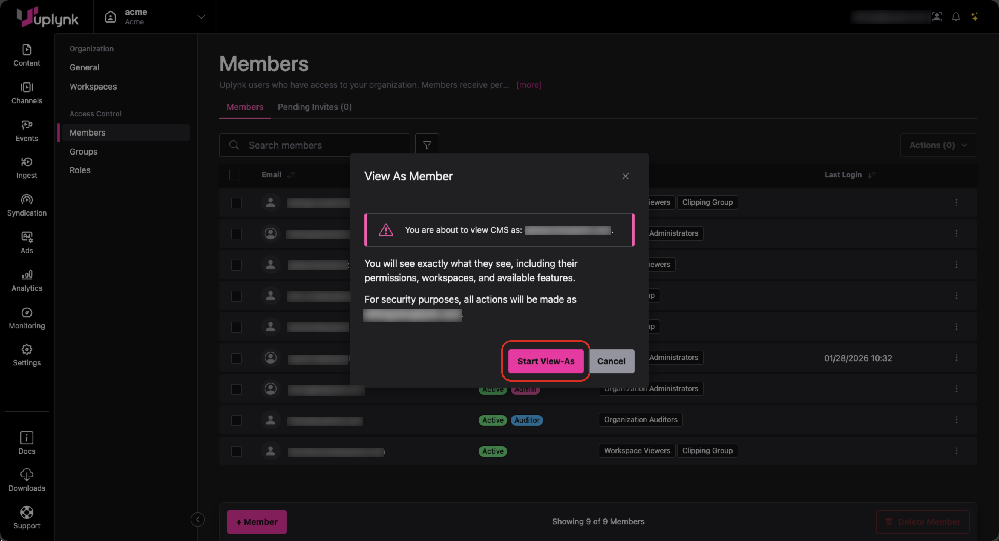 Accounts 2.0 has been enhanced to allow Org Admins the ability to view the Uplynk CMS as another member of their organization. This can aid in debugging user permissions and creating new groups and roles.
