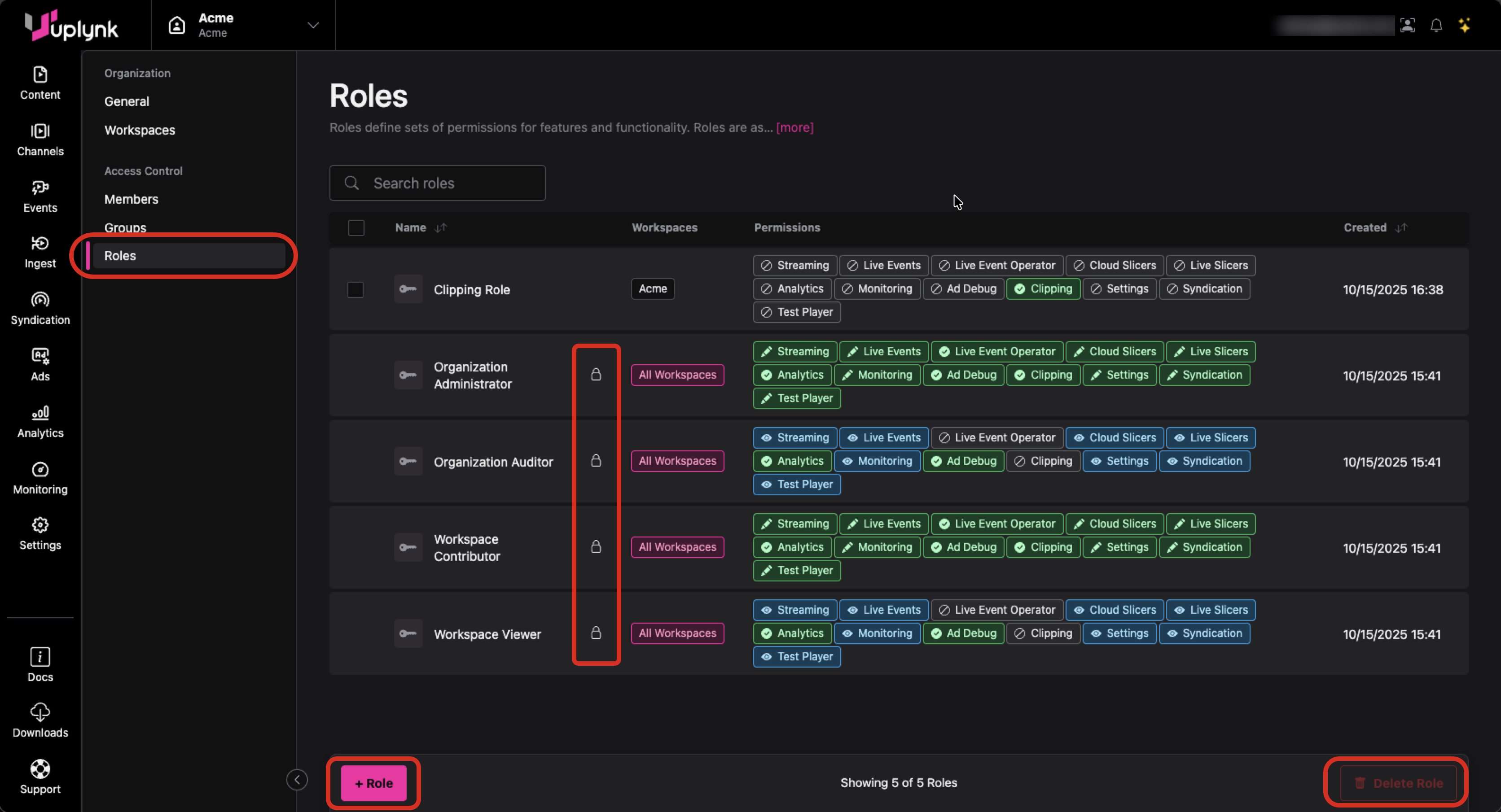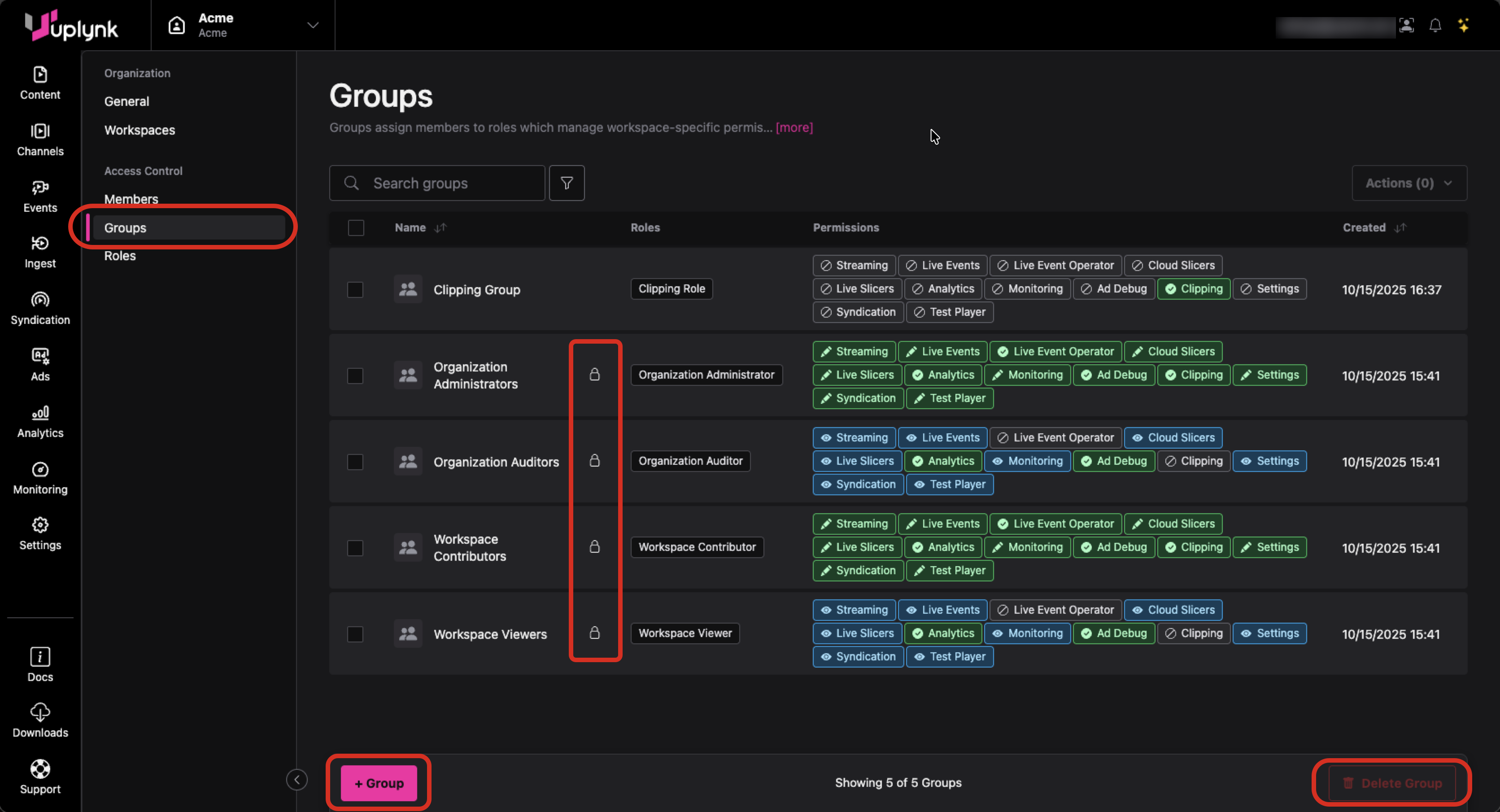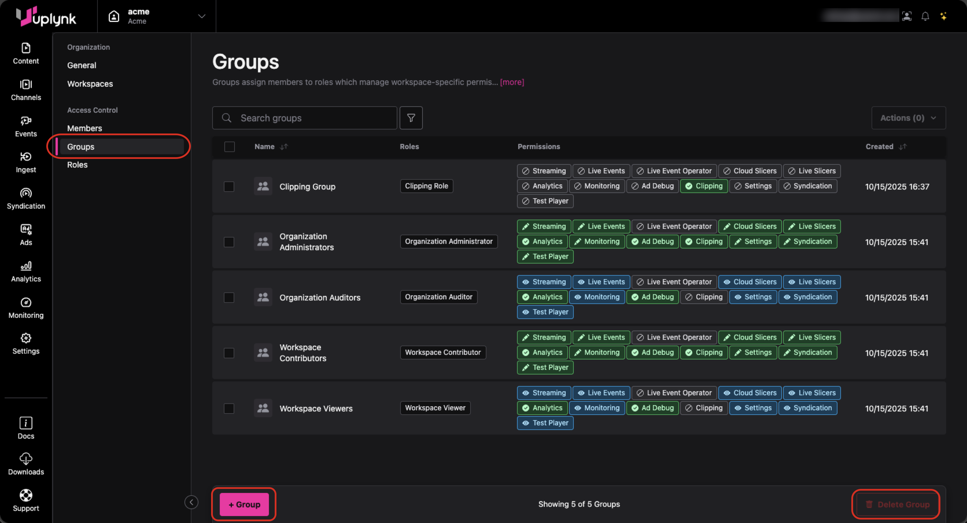 Groups have assigned roles which are a set of permissions in the Uplynk system needed to perform a given function (e.g., the ability to create content).