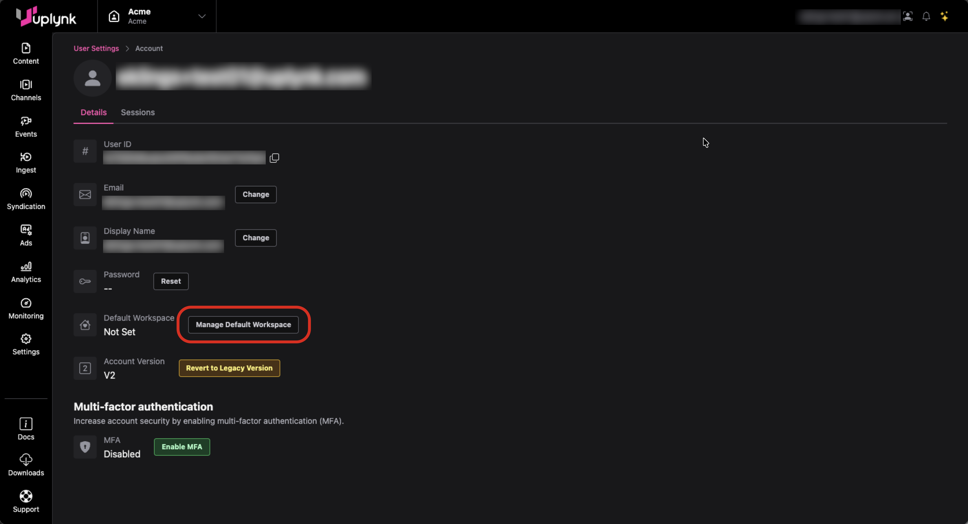 You can set a default workspace for when logging into Uplynk. If you do not set a default workspace, you will be logged into the workspace you last used.