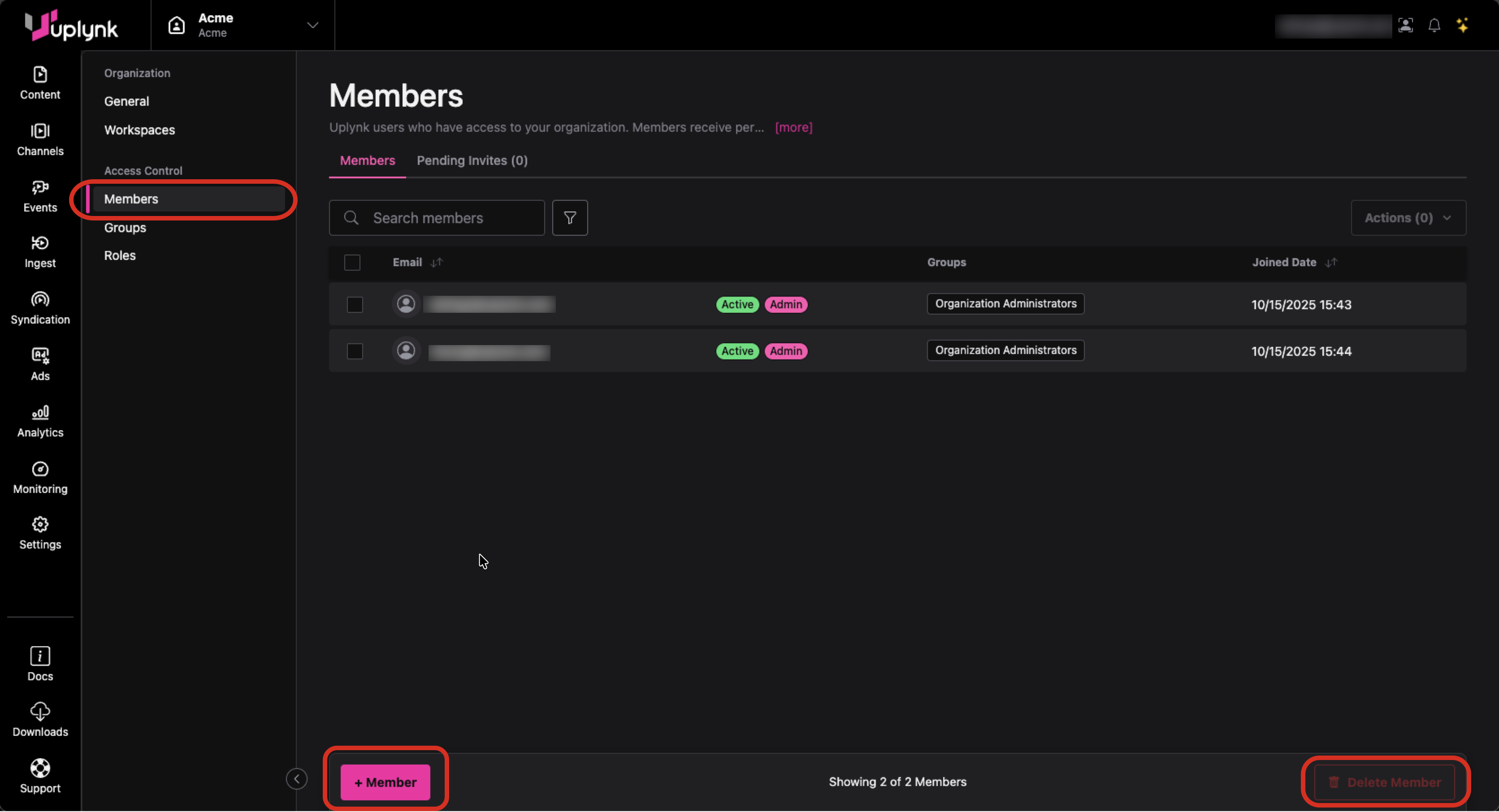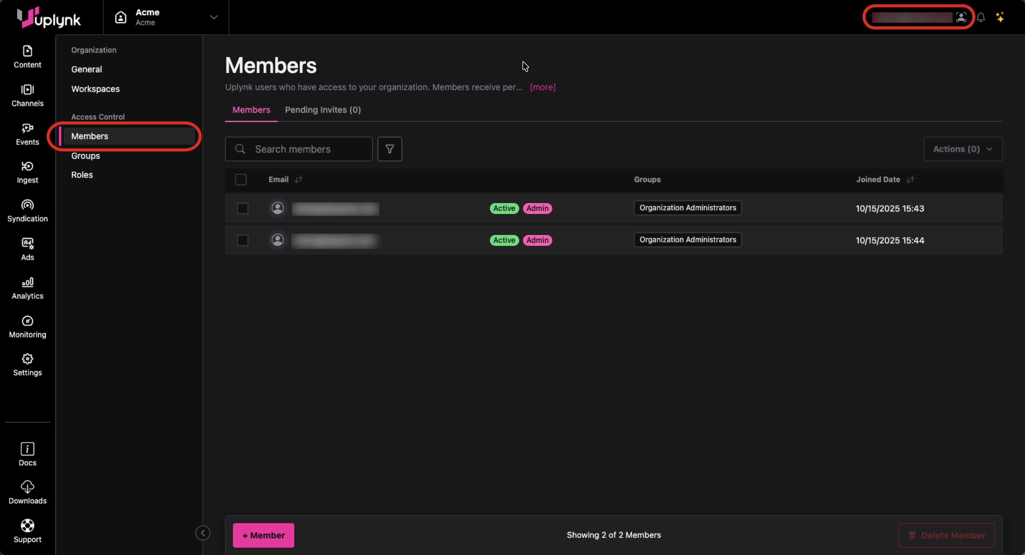 An Org Admin can show the members of the organization by selecting the Members tab of Administration settings.