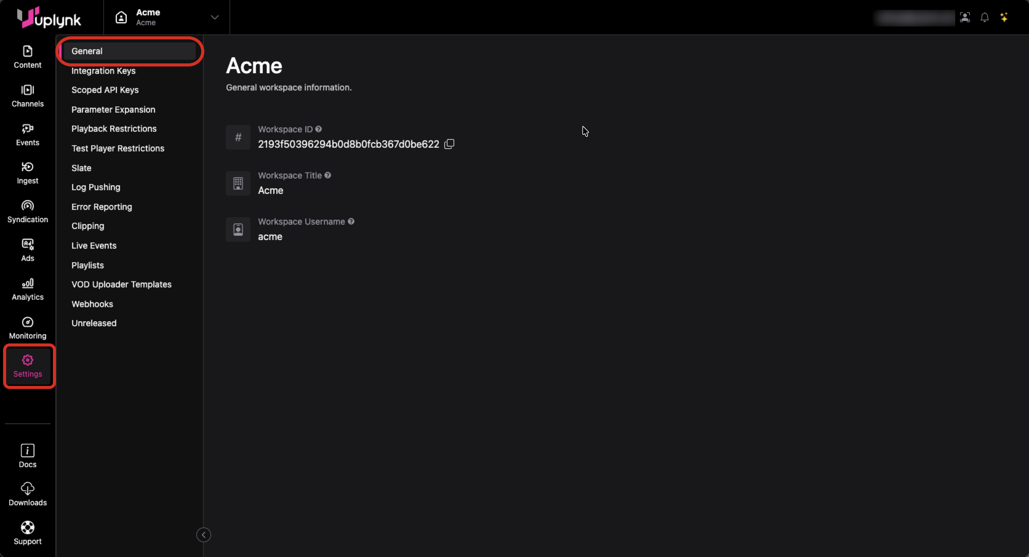 A workspace is the main area where Uplynk content will be created and managed. An Uplynk customer would have different workspaces for VOD and linear content for instance.