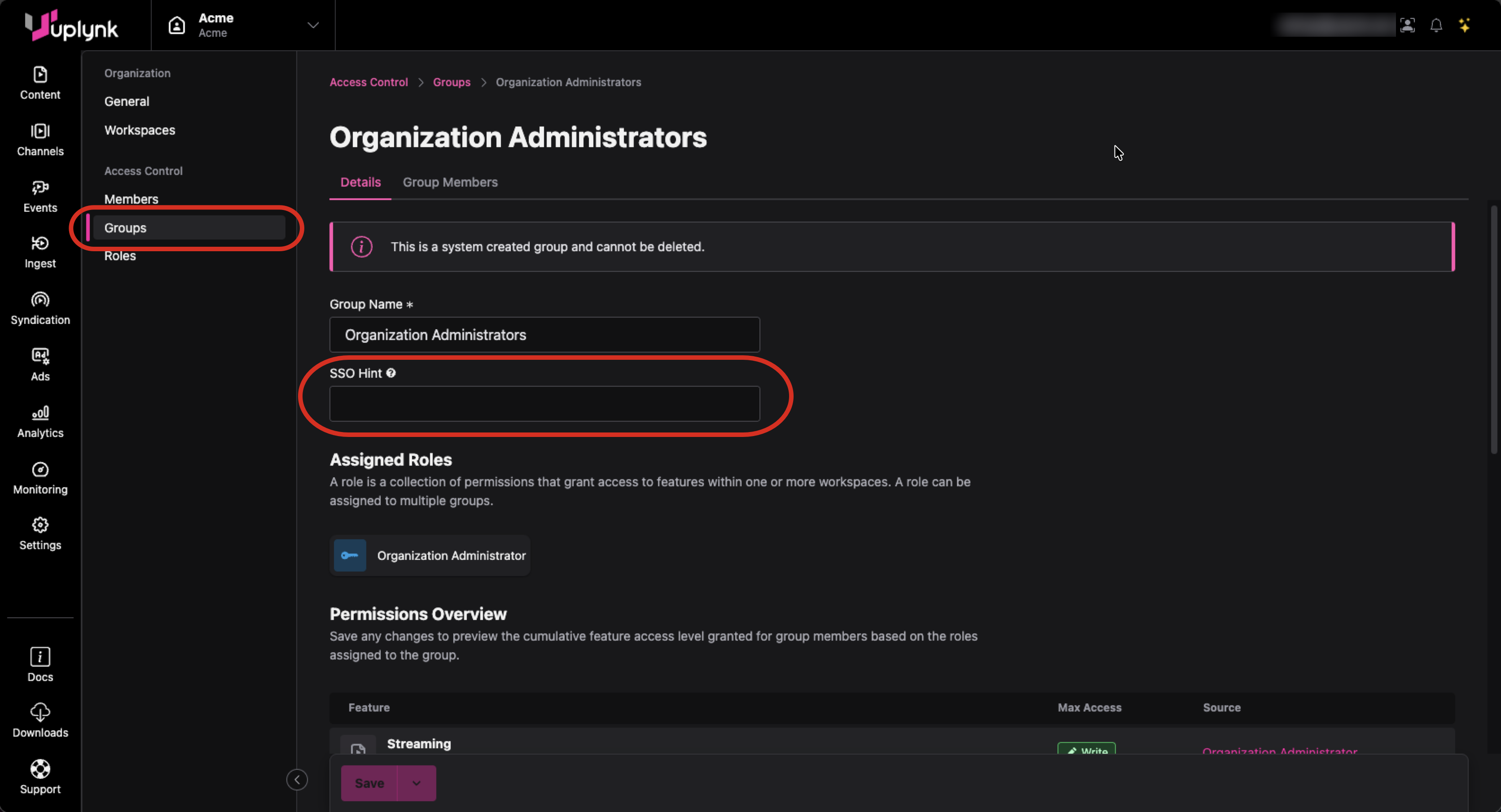 Groups can have a "hint" assigned, basically a tag to make it easier for members of groups defined using SSO to be automatically assigned to groups in Uplynk.