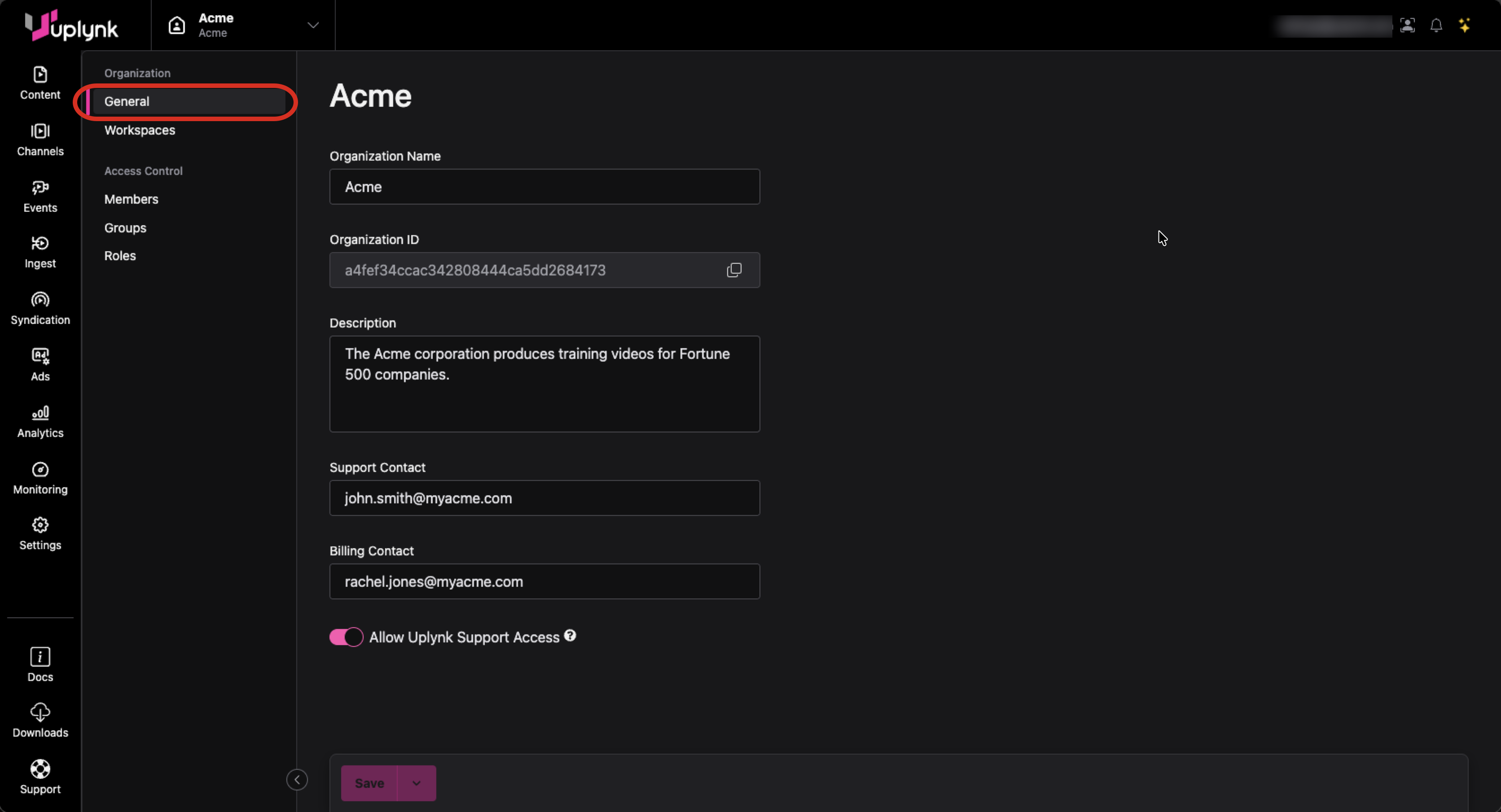 Also on this page, an Org Admin can enable/disable the ability for Uplynk Support to have access to this organization. It is recommended to have this enabled so that Uplynk Support can provide faster issue resolution.