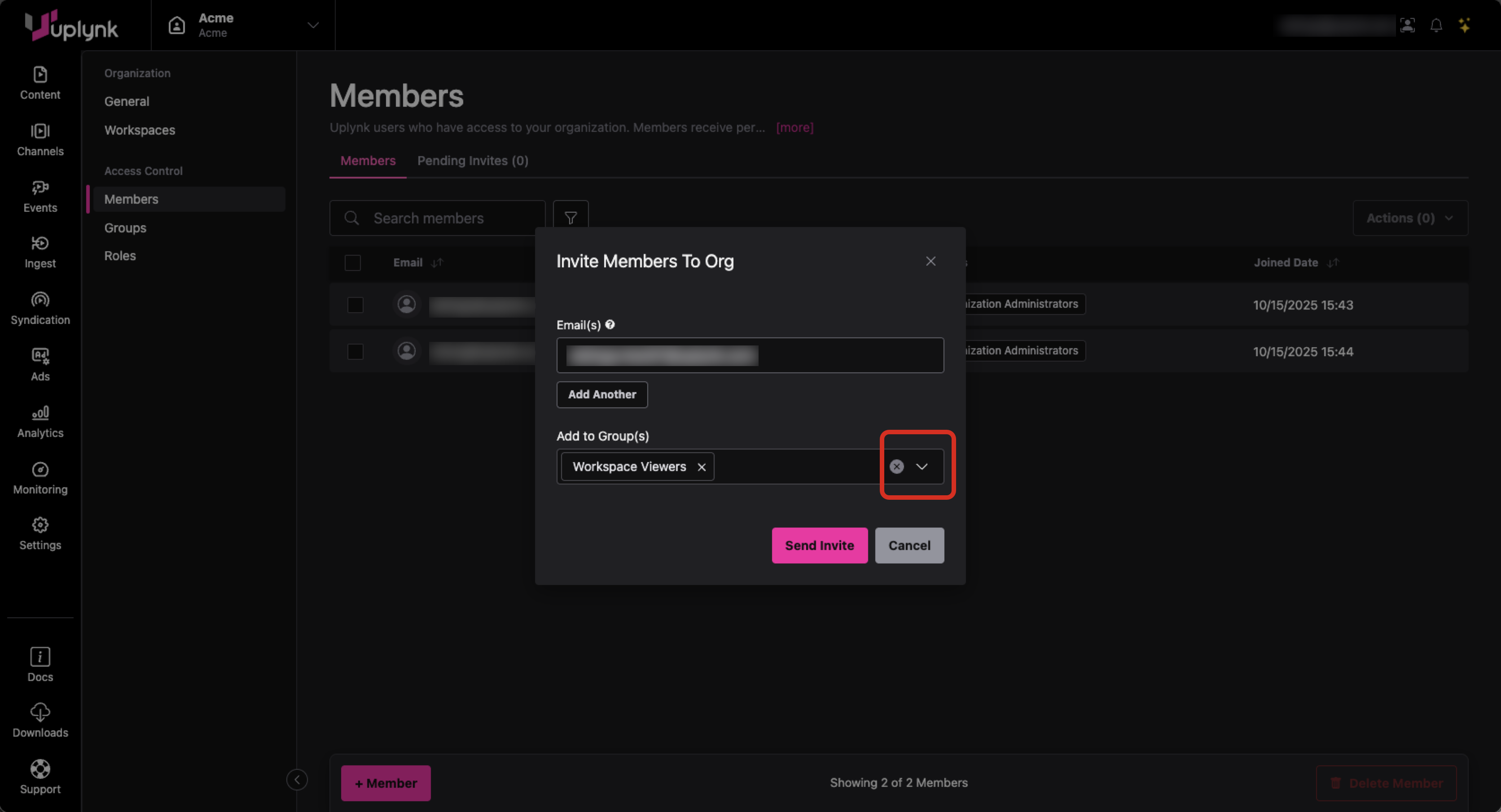 - Enter the email(s) for the user(s) to add a members of the organization and select group(s) to add the new member to using the dropdown.