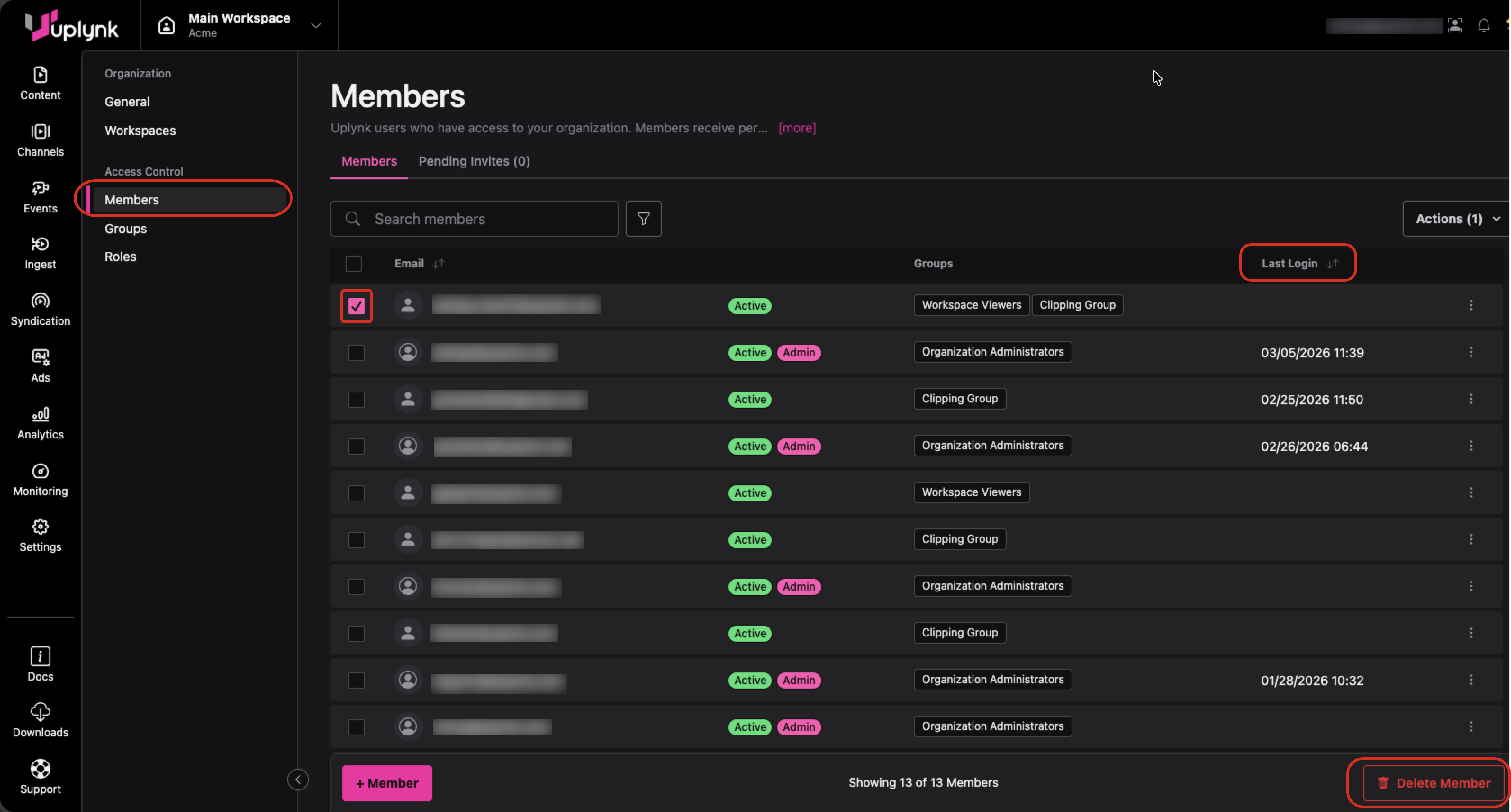 An Org Admin can delete a member from an organization. This can be because the person has left the company or no longer needs Uplynk access.