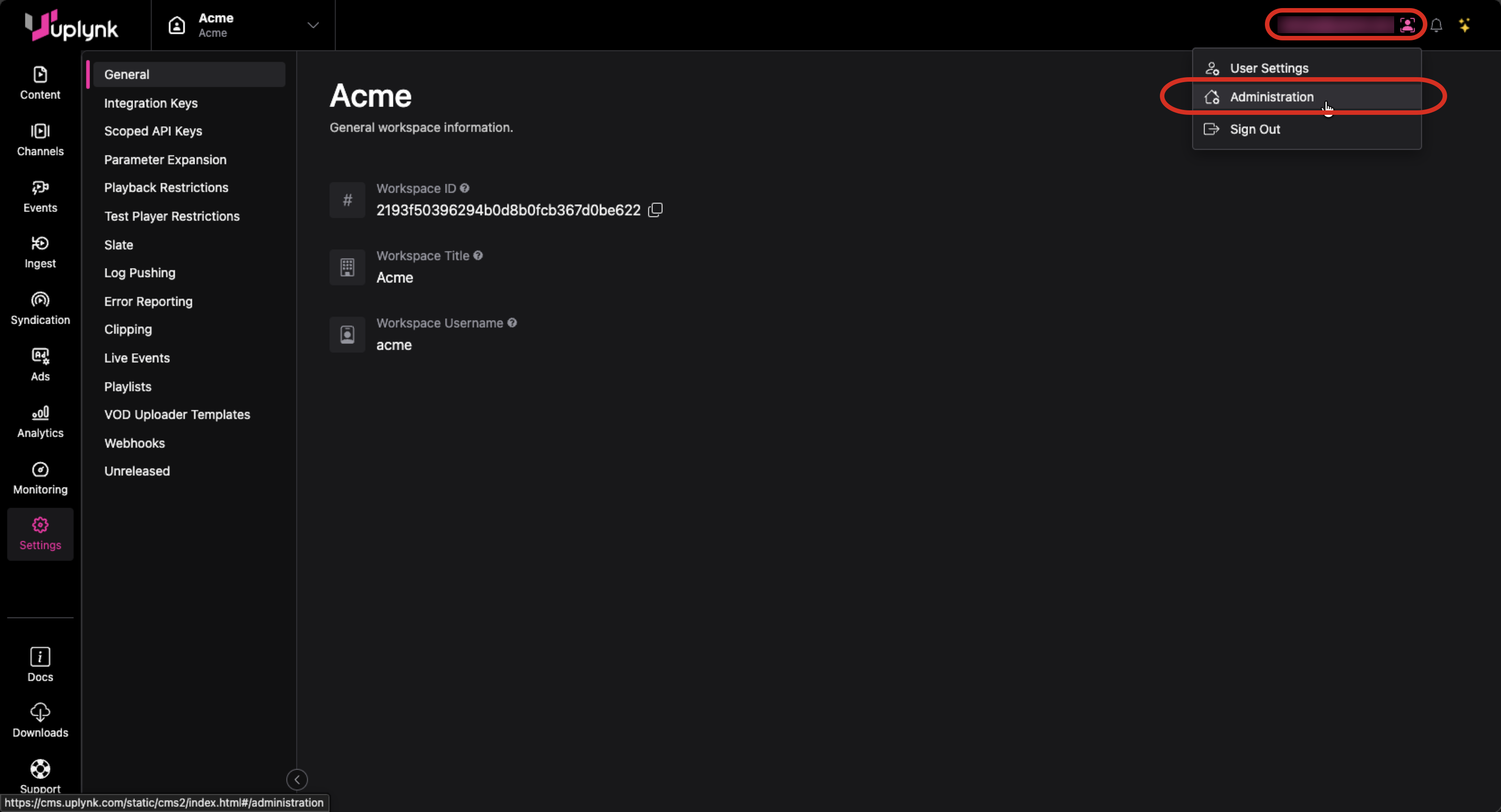 To view Administration settings, click on your username at the top right and then select Adminstration from the dropdown menu.