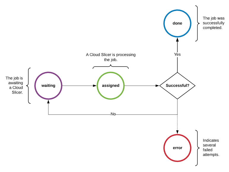 Upon creating a job, it enters the waiting state. It will remain in that state until it is assigned a Cloud Slicer. At which point, it will be in the assigned state while the Cloud Slicer processes the job. If the job is successful, it enters the done state. Otherwise, it is moved back to the waiting state in order to allow another attempt to process it. If the job cannot be processed after several attempts, it will enter the error state. This life cycle is illustrated below.
